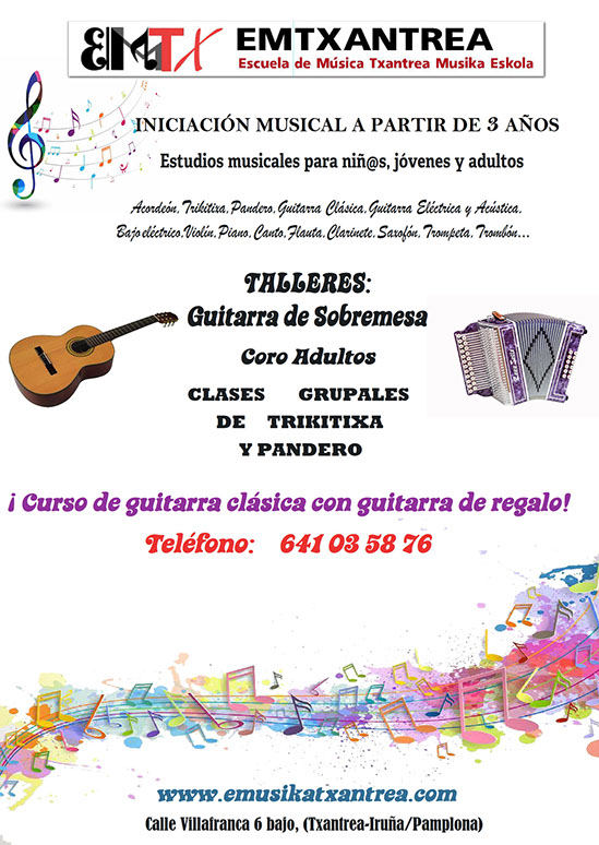 En la Escuela de Música Txantrea contamos con profesores de canto, acordeón, trikitixa, pandero, piano, violín, violonchelo, guitarra clásica, acústica y eléctrica, bajo eléctrico, ukelele, oboe, clarinete, flauta, saxofón,trompeta…  y disponemos de una amplia lista de profesores de distintas especialidades.
